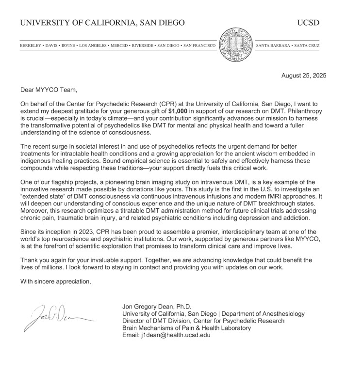 MYYCO is a Certified Benefit Corporation. 100% of profits from every liquid culture we sell are donated to 501(c)(3) organizations performing groundbreaking studies on the beneficial powers of certain mushroom species. Our current beneficiaries are MAPS, Johns Hopkins, and Heroic Hearts. View our donation records below.